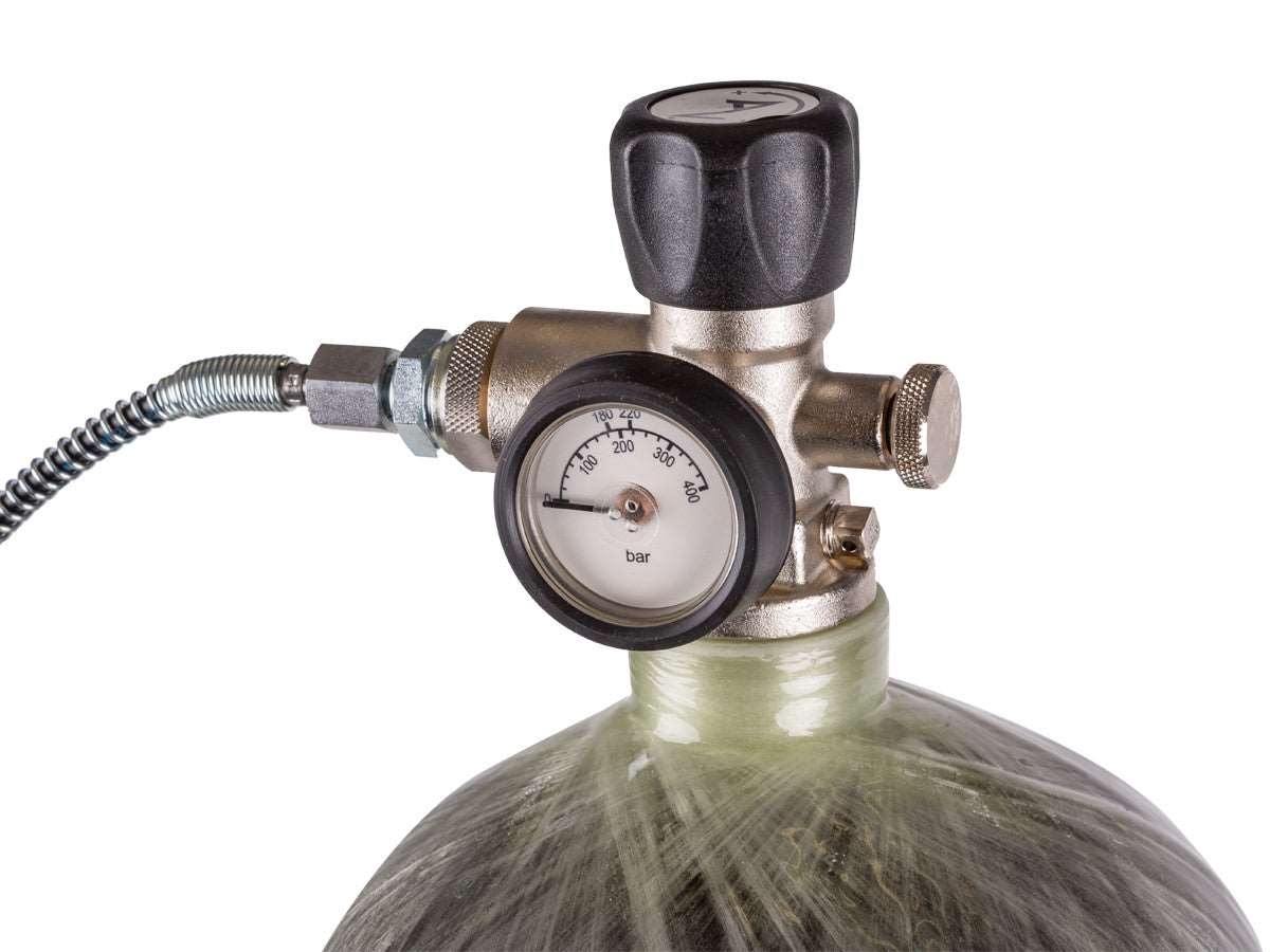 Fill your air rifles and pistols with the simple quick-disconnect fittings and be on your way to more pest control- target shooting and even competition. With 4500 psi and a whopping 98 cu. ft. capacity- enjoy the most refills of your 3000 psi airguns. The tank features stainless steel fittings- a 20 in. microbore hose and a rubberized hand wheel for controlled filling. The integrated pressure gauge lets you know when you're reaching your full charge and the bleed valve is conveniently located on the connector.