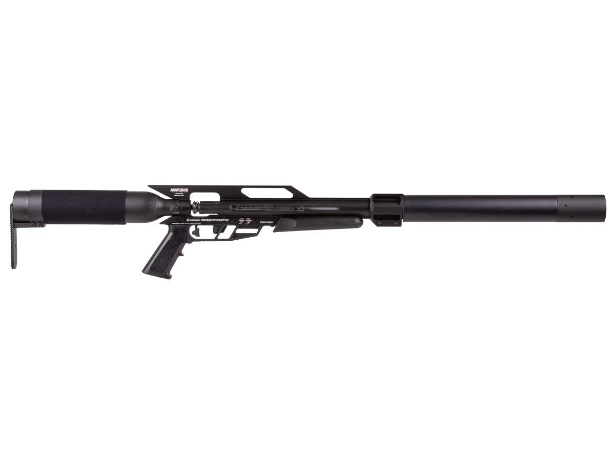 The AirForce Texan made headlines throughout the airgun industry when upon release it was billed the world's most powerful production air rifle. The Texan turned heads then, and AirForce building upon that success with the AirForce Texan SS big bore air rifle! Compared to its older brother, the Texan SS is just over 43" in carbine length while the older version is around 48". The power has been increased, thanks to its 490cc with a 200 BAR (3000 psi) fill pressure and updated TX2 valve. With those numbers, the model slings rounds downrange at muzzle energies of up to 400 fpe! What's more, the model is 20 percent lighter, weighing in at 8.45 lbs! AirForce also added a fully-shrouded barrel built Sound-Loc System technology. Compact size, sound suppression and big bore power are attributes to the perfect air rifle hunting platform. The AirForce Texan SS, a big bore without the big sound.
